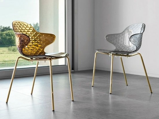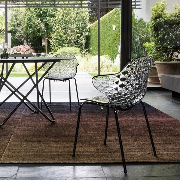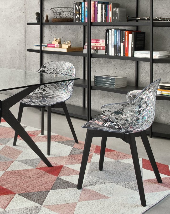 Réalisée dans différentes tonalités transparentes ou couvrantes, la coque en polycarbonate est montée sur un piètement à 4 pieds en bois ou métal.