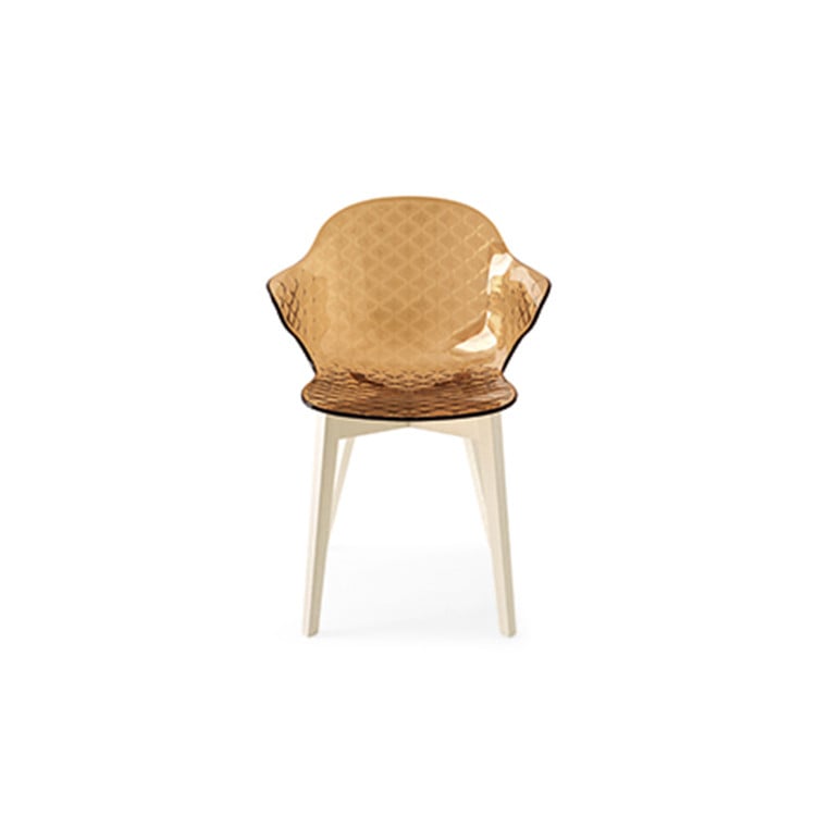Empilable et réalisée dans différentes tonalités transparentes ou couvrantes, la coque en polycarbonate est montée sur un piètement à 4 pieds en métal ou bois.